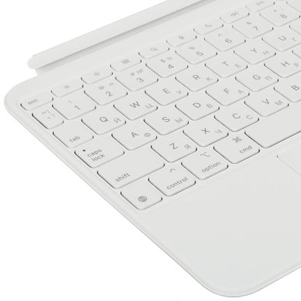 Основное внимание здесь уделено именно печати. Клавиши полноразмерные, с равномерной подсветкой и мягким, но ощутимым откликом. Ход около 1 мм создаёт баланс между скоростью и точностью, поэтому даже при длительном наборе текста пальцы не устают так быстро. Раскладка привычная, расстояние между клавишами выдержано, из-за чего ошибок при слепой печати становится меньше. Трекпад поддерживает жесты iPadOS, и это заметно упрощает навигацию: переключение приложений, прокрутка страниц и работа с текстом происходят быстрее, без постоянного касания экрана. В итоге взаимодействие с системой становится ближе к ноутбучному сценарию.